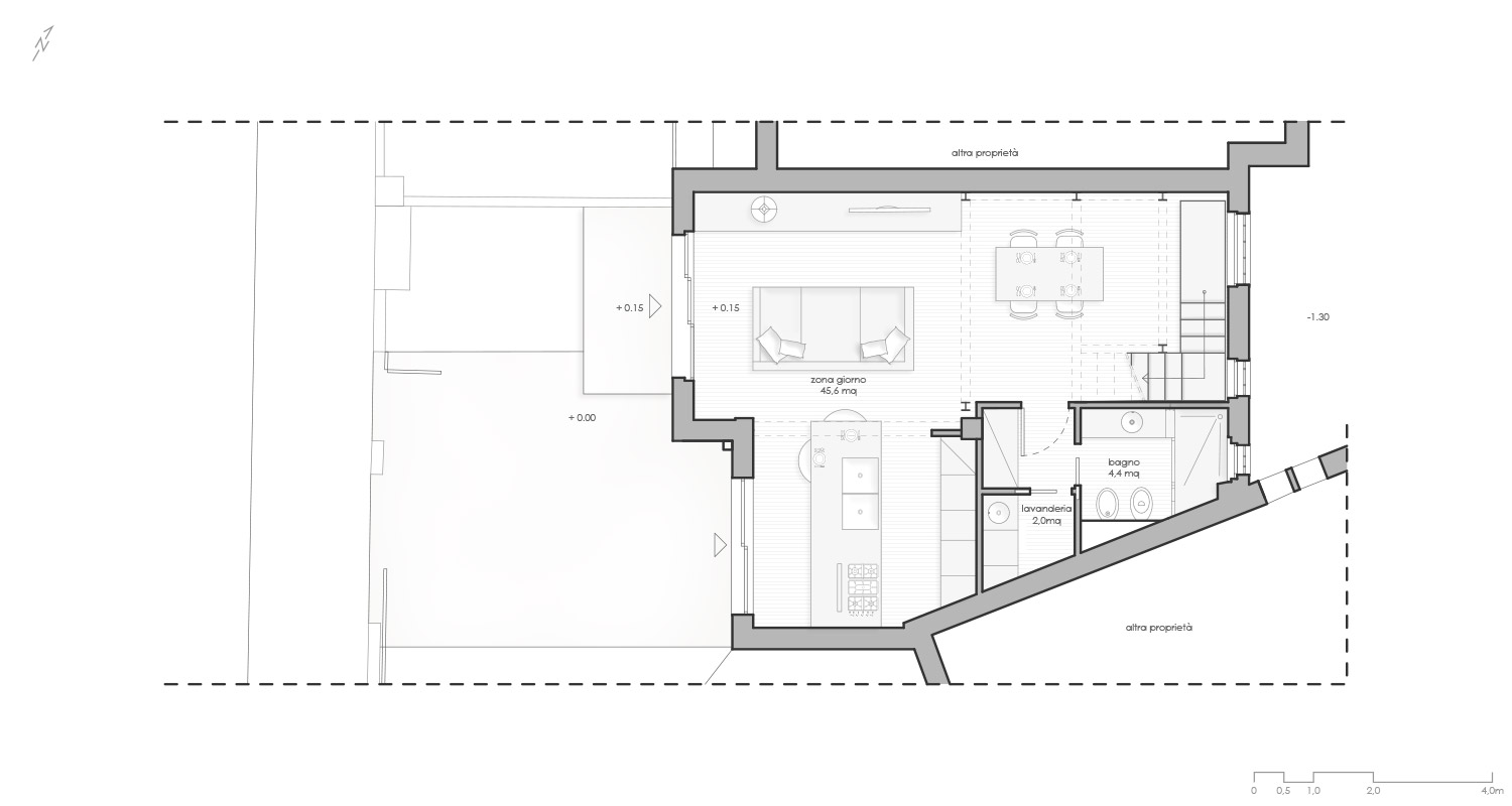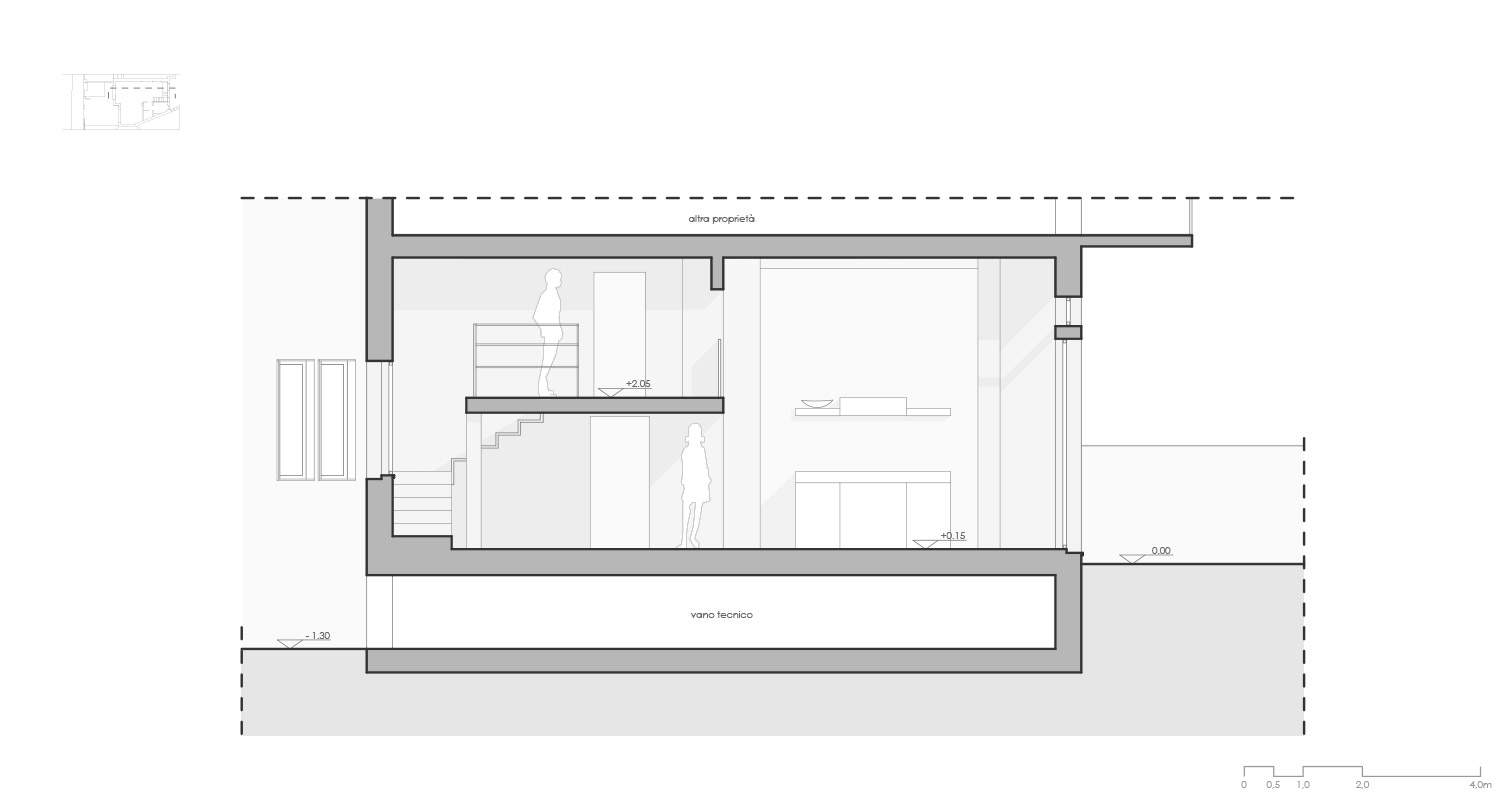 La proposta ha previsto la riconversione di due fondi a destinazione artigianale, in un'unica abitazione privata. Sfruttando l'ampia altezza, lo spazio è stato raddoppiato proponendo un soppalco dallo stile minimal e dall'atmosfera industrial.